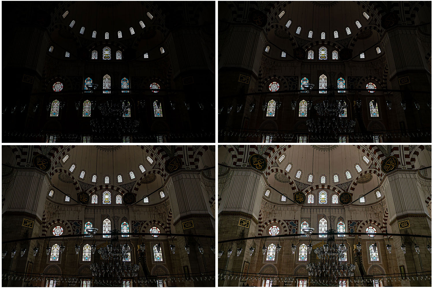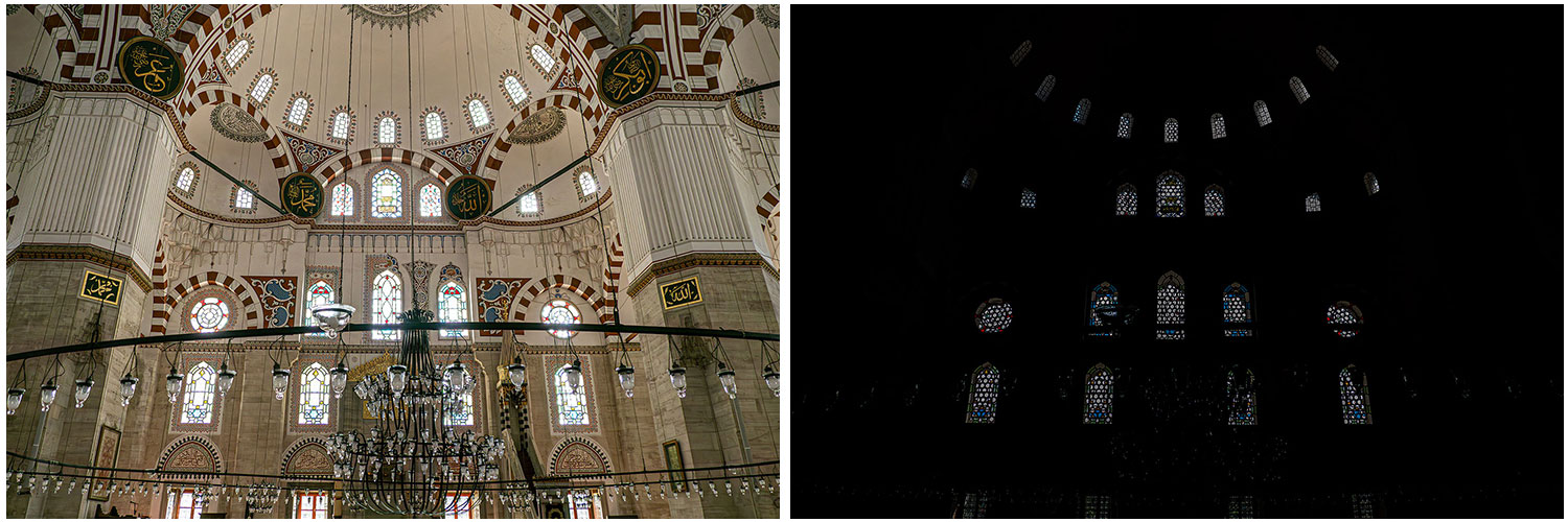 Bizler fotoğraf çekimlerinde özellikle iç mekanlarda çekim yaparken aydınlık ve karanlık bölgelerin bir arada olduğu kompozisyonlarda ışık ölçümünde ve elde ettiğimiz sonuçlarda sorun yaşayabiliyoruz. Işık ölçümünü aydınlık yerden yaparsak iç mekan tamamen karanlık, içeriden ölçtüğümüzde aydınlık alanlar detay kaybedecek kadar parlak olabiliyor. Eyüp Cami’nde yaptığım çekimde bu iki sonucu da görebilirsiniz: