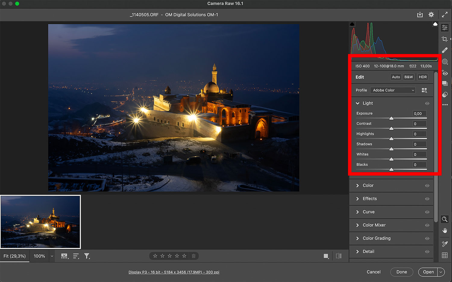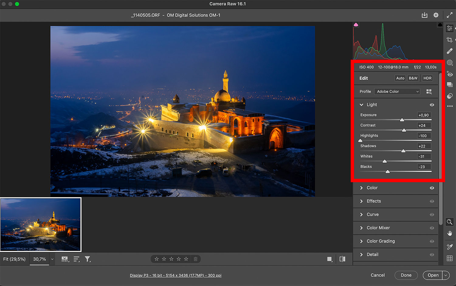 İshak Paşa Sarayı'nın genel görüntüsünü Doğu Beyazıt ile birlikte fotoğraflamak için hemen arkasındaki tepede yer alan cafe'ye çıktım. Normal koşullarda bu tarz gece çekimlerini tripod kullanarak ve 8 diyafram ile gerçekleştiriyorum. Ancak bu kez Sarsıntı Engelleyici özelliğini denenmek amaçlı bir çekim yapmaya karar verdim. Bu nedenle ISO değerini 400 olarak belirledim. Enstantaneyi (örtücü hızını) ne kadar düşürebileceğimi de denemek amacıyla diyafram değerini 22'ye kadar kıstım. Bu sayede enstantane değeri 13 saniyeye kadar düştü. Sonuçları ekranımda görüntülediğimde, OM1'in Sarsıntı Engelleyici özelliğinin ne kadar etkili olduğunu bir kez daha deneyimledim. 13 saniye boyunca elde çekim yapmama rağmen, fotoğraflarımın keskinliği ve detayları hayran bıraktı. Çektiğim fotoğrafın RAW ekranından tercih ettiğim değerleri görmeniz mümkün...