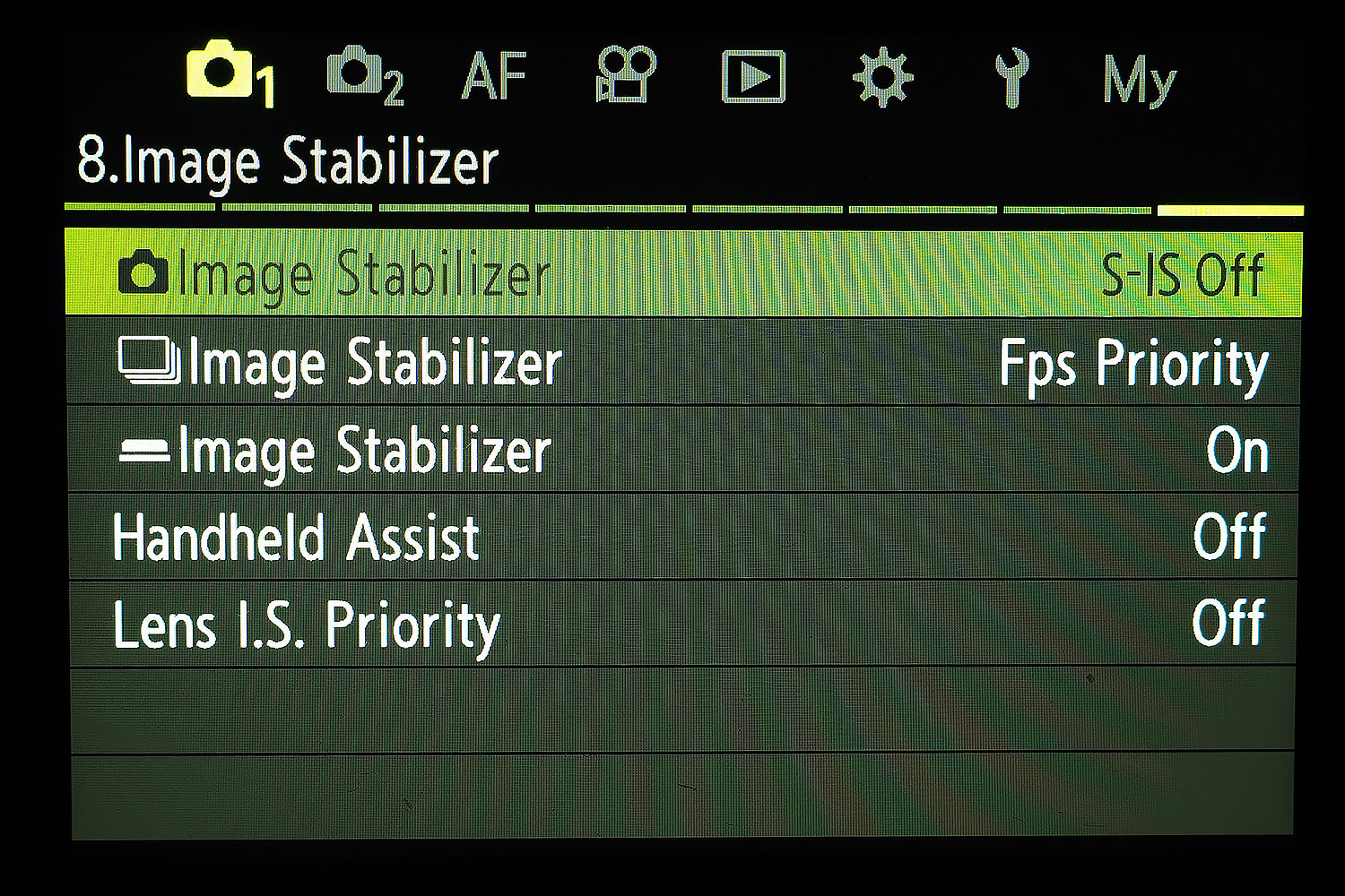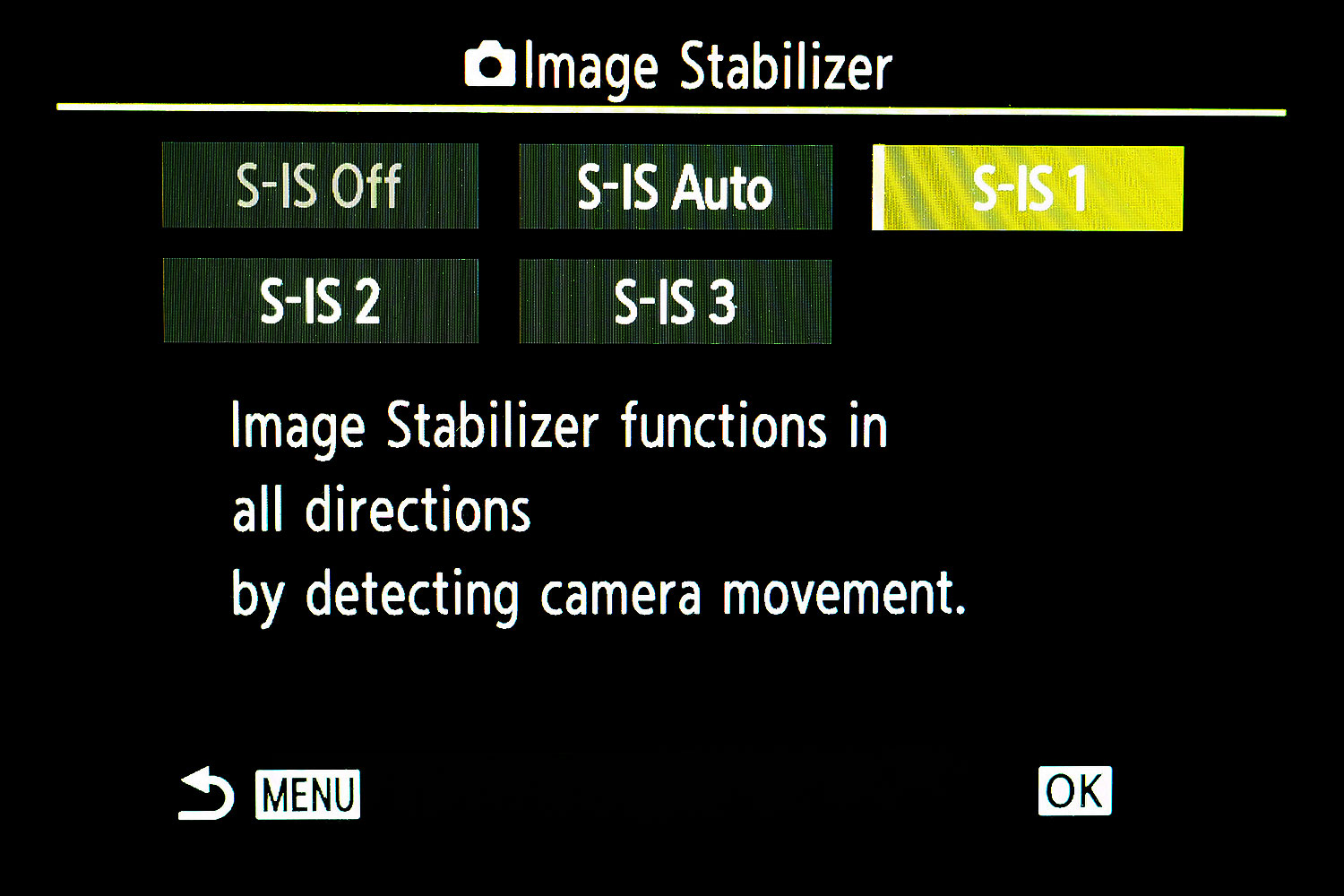 OM1'in Image Stabilizer menüsü içinde biri OFF (kapalı) seçeceği olmak üzere toplam 5 alternatif bulunuyor. S-IS Auto seçeneği makinenin sebep olunan hareketi kendisinin algıladığı ve bunu engelleyecek titreşimi sağladığı seçenek. S-IS2 dikey, S-IS ise yatay hareket için tercih ediliyor. Ancak ben genelde S-IS1 seçeneğini kullanıyorum ve öneriyorum. Bu seçenek ALL DIRECTION (tüm yönler) anlamına geliyor ve sebep olacağınız herhangi bir yöndeki hareket için de yardımcı oluyor.