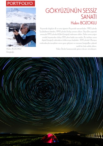 262 OM SYSTEM YOLLARDAPORTFOLYOG%u00d6KY%u00dcZ%u00dcN%u00dcN SESS%u0130Z SANATIHalim BOZOKLUKayseride do%u011fdum ilk ve orta %u00f6%u011fretimi Kayseride tamamlad%u0131m. 1983 y%u0131l%u0131nda T%u0131p fak%u00fcltesini bitirdim, 1990 y%u0131l%u0131nda Uroloji uzman%u0131 oldum. Slayt filmi yapmak amac%u0131yla 1993 y%u0131l%u0131nda ilk filmli foto%u011fraf makinas%u0131n%u0131 ald%u0131m. Daha sonra yo%u011fun meslek hayat%u0131mdan dolay%u0131 2011 y%u0131l%u0131na kadar ara verdim. Bu tarihten sonra digital foto%u011fraf makinalar%u0131n%u0131 kullanmaya ba%u015flad%u0131m. 2015 y%u0131l%u0131nda Olympus makinalar%u0131yla tan%u0131%u015ft%u0131ktan sonra gece g%u00f6ky%u00fcz%u00fc ve manzara foto%u011fraflar%u0131 %u00e7ekerek zevkli bir hobi sahibi oldum. Halim BOZOKLU Halen Devlet hastanesinde g%u00f6reve devam etmekteyim.Foto%u011fraf%u00e7%u0131