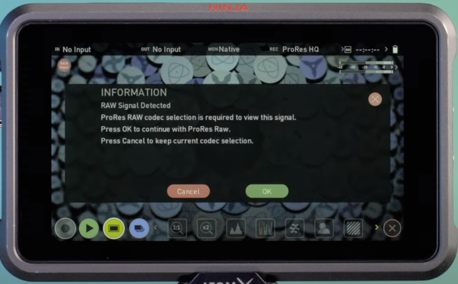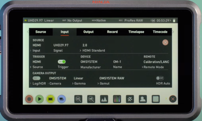 ProResRAW Video Kaydı için OM-1 yapılması gereken ayarlar: * OM-1'in güç düğmesini ON durumuna getirin. * Menü tuşuna basıp Video Alt menüsünde (4. menü) erişin. * 1 nolu sekmede Aşağı ok tuşu ile Mode ayarına gelerek çekim modunu M (Manual) olarak seçin. ![]() * 5 nolu sekmede HDMI Output Settings ayarını Output Mode "Monitör", Time Code "On" olarak seçin. ![]() * 1 nolu sekmede video codec ve çözünürlüğünü seçin. * 2 nolu sekmede Picture Modu ayarını OM Log-400 olarak seçin. ![]() * 5 nolu sekmeye tekrar girerek HDMI Output Settings ayarını RAW olarak seçin. ![]() Şimdi Atomos Ninja V'i güç düğmesini ON durumuna getirin. ProResRAW Video Kaydı için Atomos Ninja yapılması gereken ayarlar: