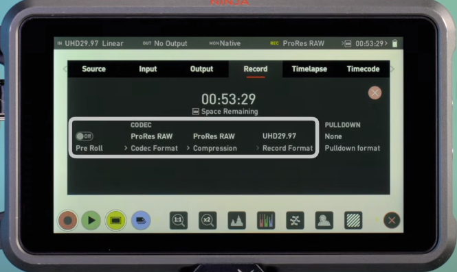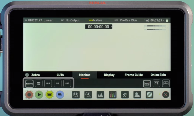 ![]() * Ekrana dokunarak "Input" sekmesine gelin, Trigger ayarını "ON", Source ayarını "HDMI" olarak belirleyin. ![]() * "Record" sekmesine gelin ve codec ayarını "Prores RAW" olarak seçin. ![]() * "Monitör menüsünde" giriş sinyalini izlemek için 5 ayrı seçenek mevcuttur: ![]() - Native - Rec 709 - HLG - PQ - LUT * SDR izleme için "Native", "Rec 709" veya "LUT" olarak seçebilirsiniz. * HDR izleme için "HLG" veya "PQ" olarak seçebilirsiniz. |
