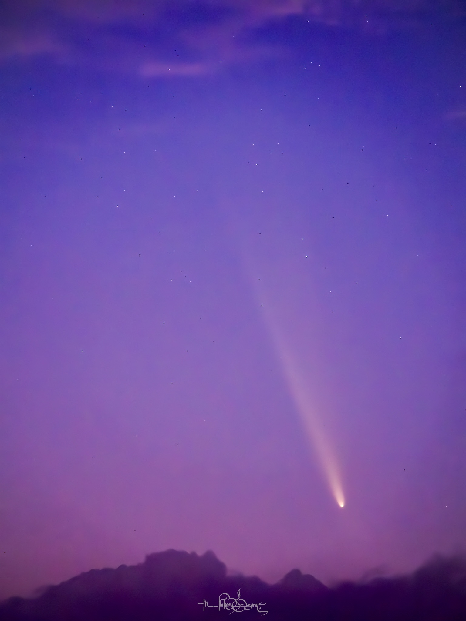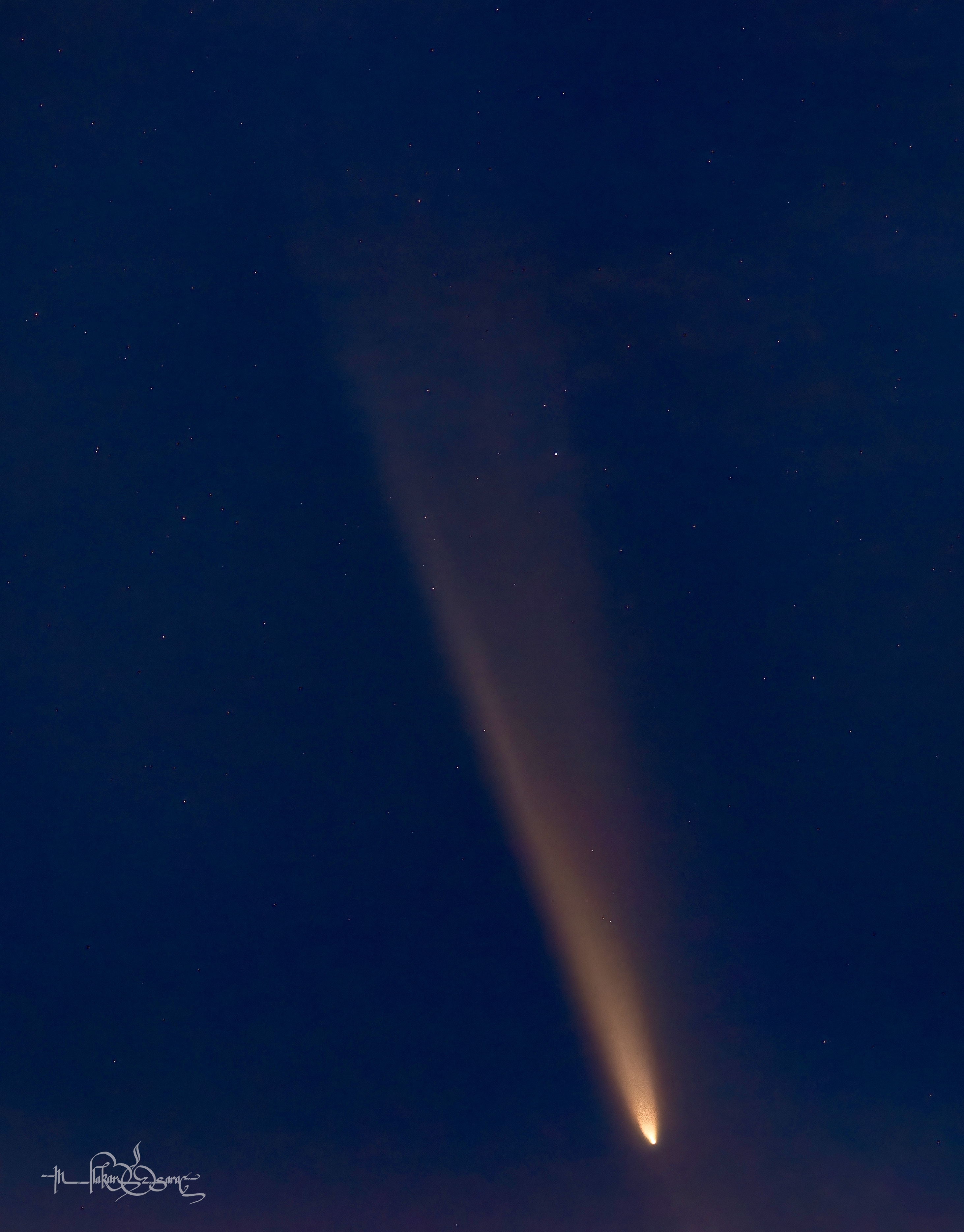 Tsuchinshan, yüzyılın en parlak kuyruklu yıldızı olabilir mi ? ☄️ ![]() OM System OM-1 + M.Zuiko 90mm F3.5 IS Macro 13 Ekim akşamı hava bulutluydu ama bir ümit bu muhteşem parlaklıktaki kuyruklu yıldızı fotoğraflamak için sokak köpeklerinden biraz çekinerekte olsa her zamanki gökyüzü çekim yerime gittim . İlk karede görünce çok sevindim, adeta bulutlar kuyruklu yıldızı çekebilmem için ikiye ayrılmıştı. Bunu fırsat bilip yaklaşık 50-60 kare çektim. Ve bunların netlik ve ışık olarak iyi olan 44 tanesini pixinsight yazılımı ile önce yıldız hizalaması ardından da istifleme yaptım. Tek başına zoom yaptığım kuyruk bölgesinin daha net göründüğü kareyi istiflediğim fotoğraftan elde ettim. ![]() OM System OM-1 + M.Zuiko 90mm F3.5 IS Macro Bu, her 80.000 yilda bir Dünya'nin yakınından geçen Tsuchinshan-ATLAS Kuyruklu yıldızıdır. Bu fotoğrafı dünyaya en yakın oldugu 71 milyon km uzakta iken çektim. Kuyruğunun 29 milyon km uzunluğunda olduğu tahmin ediliyor!! Kuyruklu yıldızın kendisi yaklaşık 3,2 km genişliğindedir. Gün batımından kısa bir süre sonra şehir ışıklarından uzak bir yerde batı ufkuna bakarak önümüzdeki birkaç hafta boyunca görebilirsiniz. ![]() OM System OM-1 + M.Zuiko 90mm F3.5 IS Macro |